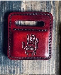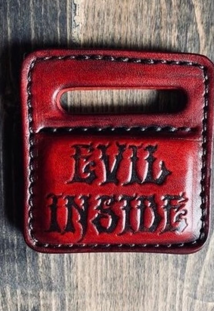 This is a leather weighted bandana holder that weighs approximately 8-9 oz. It keeps your bandana neatly, comfortably, and securely in your back pocket even while riding. Simply fold your bandana, slide it into the slot of the Pocket Lock, then slide the Pocket Lock into your back pocket. The Pocket Lock is filled with 6 oz. of hand poured lead, all edges on it are burnished smooth. This is a Harp Leather original item that I came up with after losing one too many bandanas while on my scoot. Choose from Evil Inside or Evil Inside bloody handprint logo. Backs of each are stamped with my Made in America stamp design.