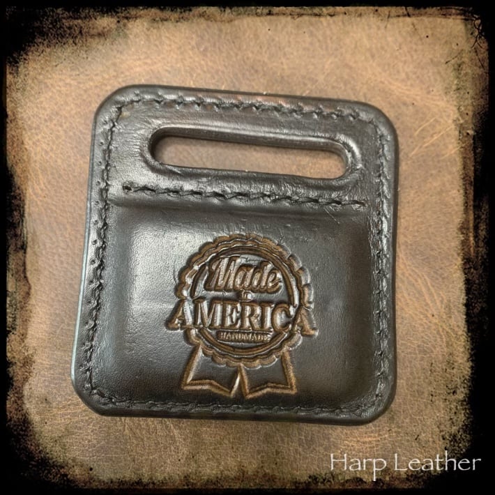 This is a leather weighted bandana holder that weighs approximately 8-9 oz. It keeps your bandana neatly, comfortably, and securely in your back pocket even while riding. Simply fold your bandana, slide it into the slot of the Pocket Lock, then slide the Pocket Lock into your back pocket. The Pocket Lock is filled with 6 oz. of hand poured lead, all edges on it are burnished smooth. This is a Harp Leather original item that I came up with after losing one too many bandanas while on my scoot. Stamped with a Punisher skull on one side and American made on the other.